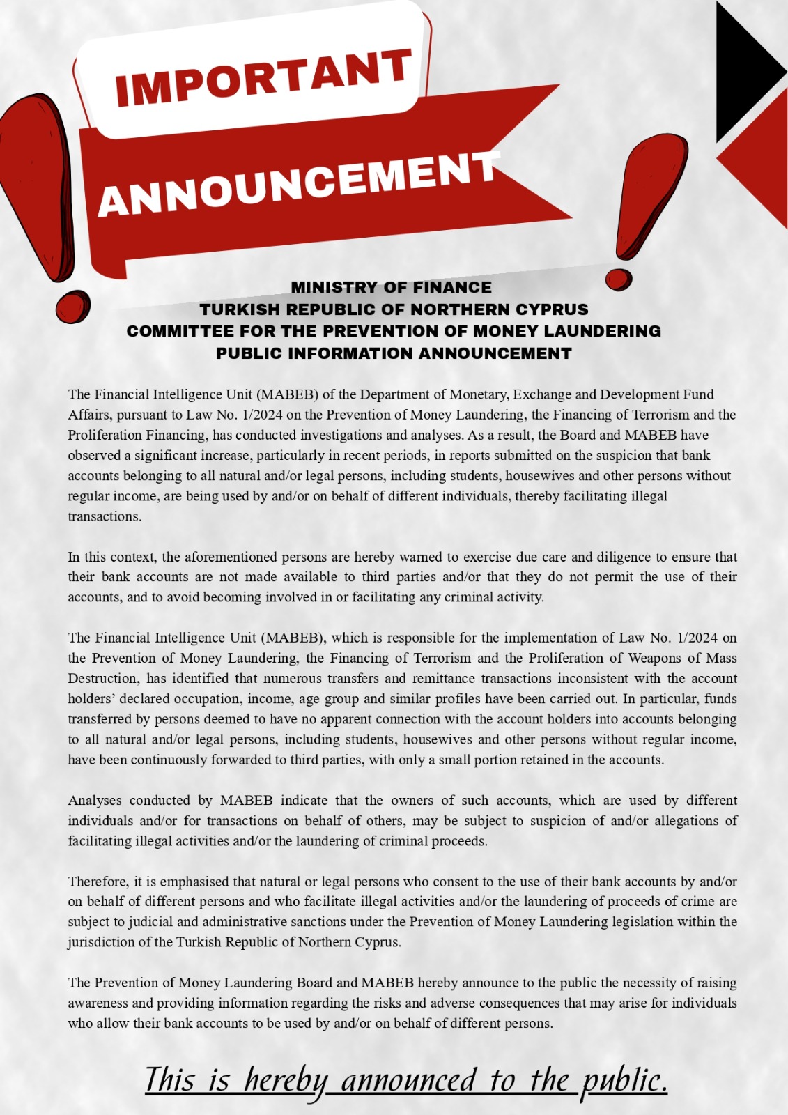 Therefore, it is emphasised that natural or legal persons who consent to the use of their bank accounts by and/or on behalf of different persons and who facilitate illegal activities and/or the laundering of proceeds of crime are subject to judicial and administrative sanctions under the Prevention of Money Laundering legislation within the jurisdiction of the Turkish Republic of Northern Cyprus.