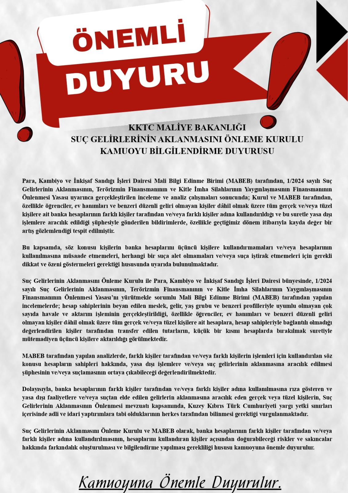 “Para, Kambiyo ve İnkişaf Sandığı İşleri Dairesi Mali Bilgi Edinme Birimi (MABEB) tarafından, 1/2024 sayılı Suç Gelirlerinin Aklanmasının, Terörizmin Finansmanının ve Kitle İmha Silahlarının Yaygınlaşmasının Finansmanının Önlenmesi Yasası uyarınca gerçekleştirilen inceleme ve analiz çalışmaları sonucunda; Kurul ve MABEB tarafından, özellikle öğrenciler, ev hanımları ve benzeri düzenli geliri olmayan kişiler dâhil olmak üzere tüm gerçek ve/veya tüzel kişilere ait banka hesaplarının farklı kişiler tarafından ve/veya farklı kişiler adına kullandırıldığı ve bu suretle yasa dışı işlemlere aracılık edildiği şüphesiyle gönderilen bildirimlerde, özellikle geçtiğimiz dönem itibarıyla kayda değer bir artış gözlemlendiği tespit edilmiştir.